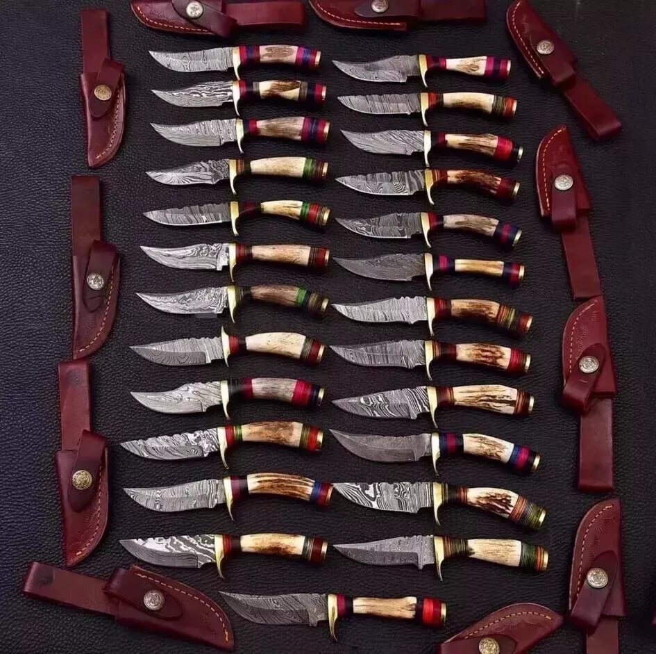Elevate your inventory with this premium wholesale set of 100 handcrafted Damascus steel skinner knives, expertly designed for outdoor enthusiasts, collectors, and premium retail buyers. Each knife is a masterpiece of traditional blacksmithing, forged by third-generation artisans with decades of expertise.
